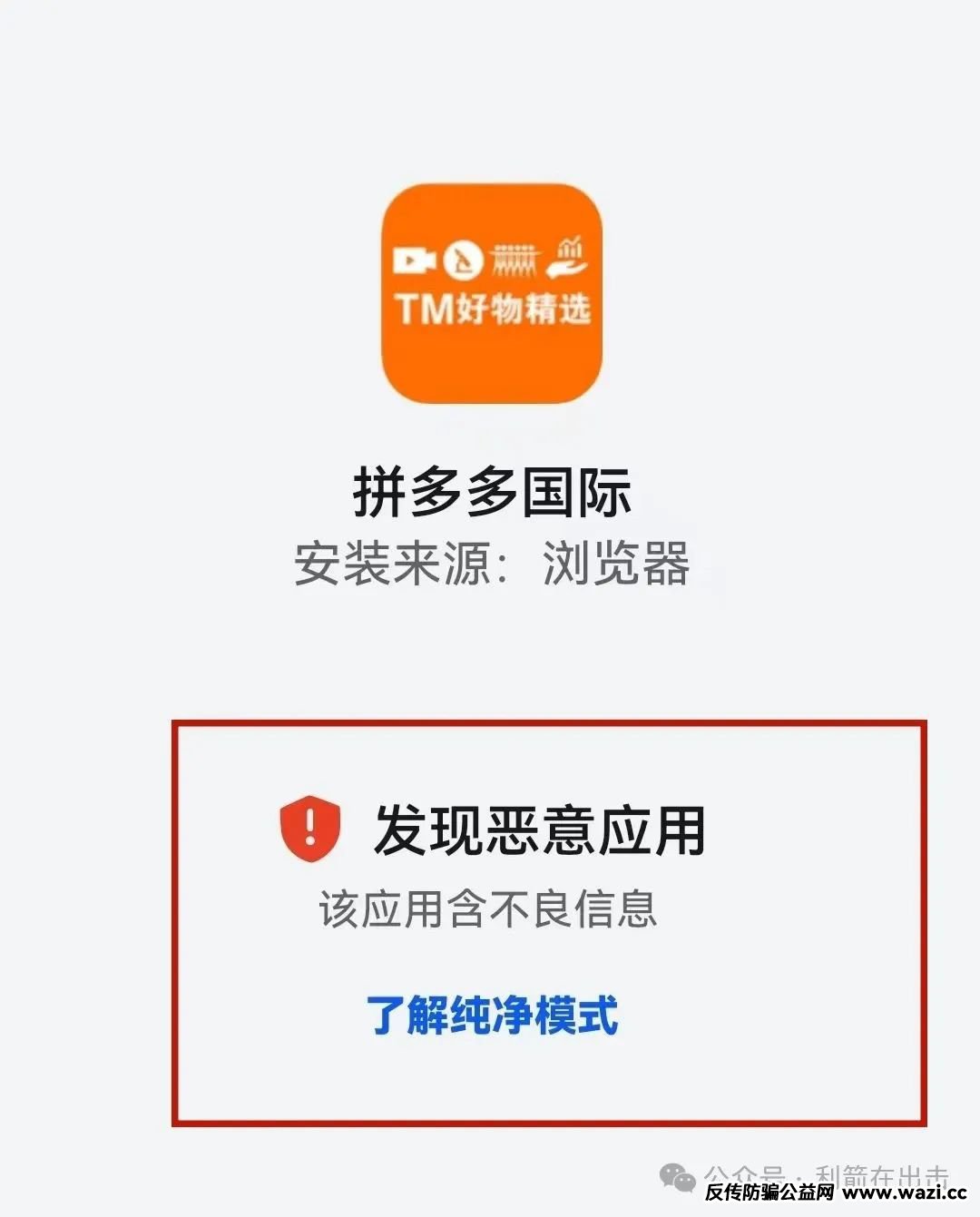 在微信中打开“拼多多国际”的下载链接,已经被屏蔽,屏蔽理由:网页存在安全风险...........说明了这是有问题的项目。