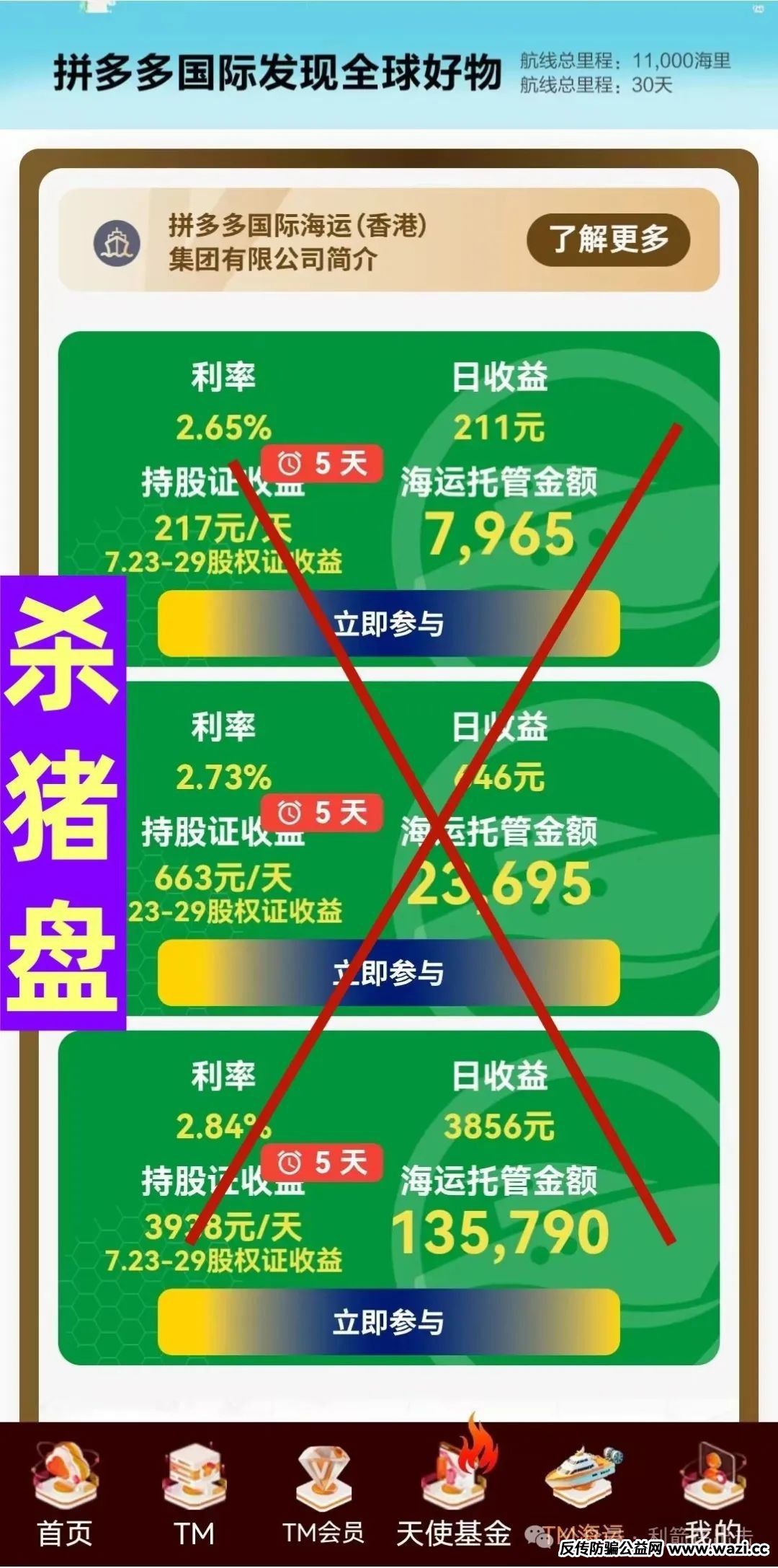 诈骗平台是以骗钱为目的,在“拼多多国际”APP中,利箭小编看到了投资金额越来越大,时间越拉越长的杀猪盘,“持股证收益”、“海运托管”?都是假的,骗钱的噱头而已!充值页面上暴露了这是诈骗洗钱的杀猪盘。