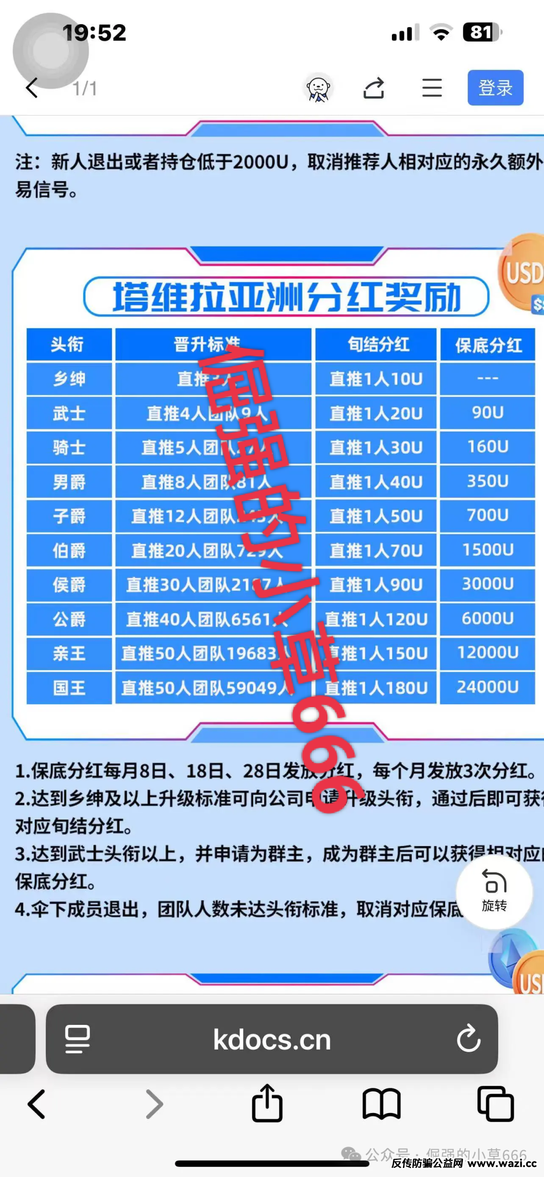 另外,塔维拉(TAVIRA.ASIA)的跟单模式还存在着严重的“拉人头”嫌疑。平台规定,每日限2次跟单交易,但拉人头发展下线可解锁额外次数。发展20人团队就能获得“社群任务奖励”,设置“武士”“伯爵”等10级头衔,这一点和鑫慷嘉的“班长”“司令员”一样,晋升需要达成直推人数及团队规模指标,高层级还能瓜分下级收益的“扶持奖” 。这种模式下,收益并非来自于真实的投资回报,而是依靠新进资金来维持,本质上就是传销。一旦拉新停滞,整个资金盘就会瞬间崩塌。