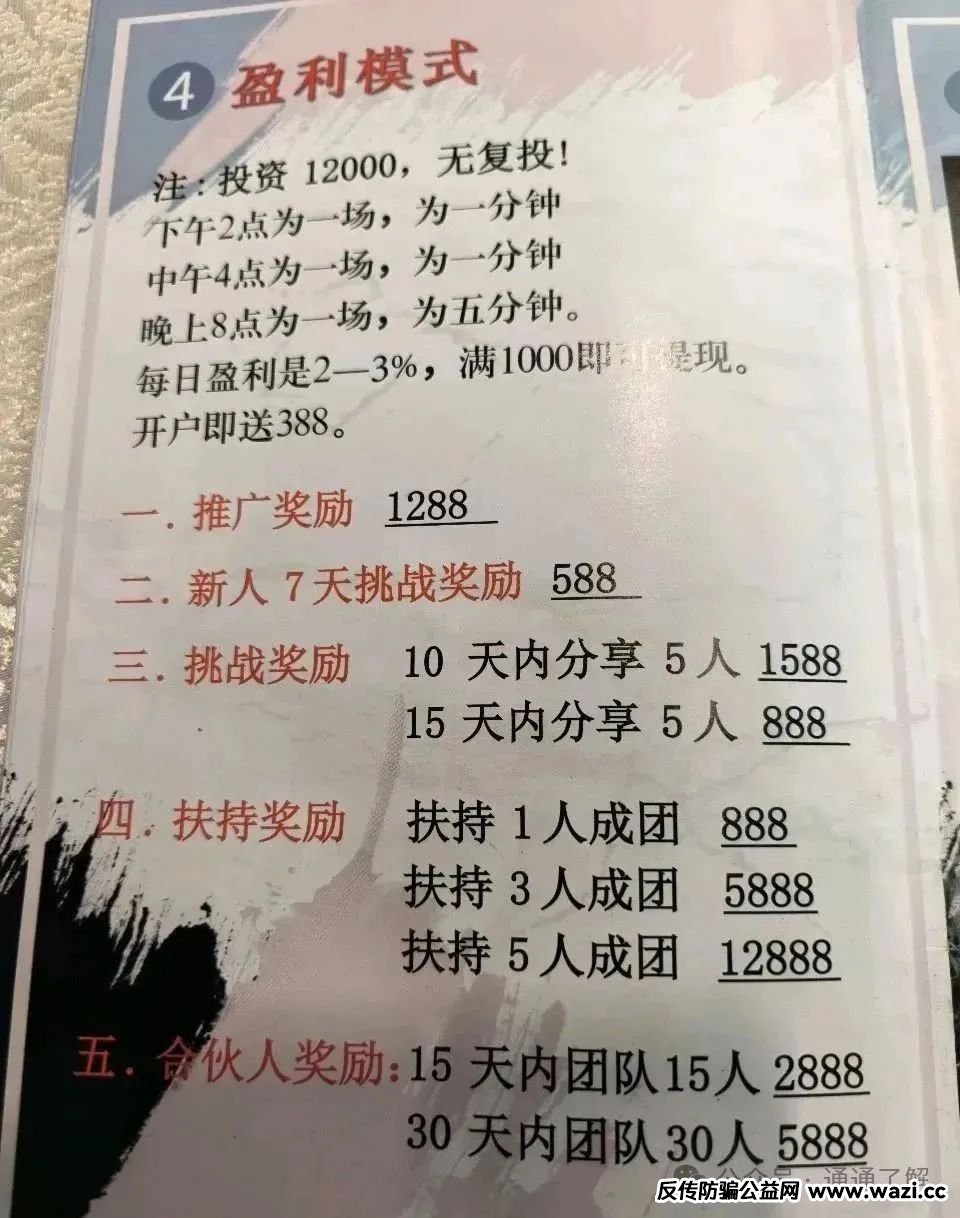 ◦ 五级传销架构:设置“合伙人→区域代理”等级,拉1人奖励投资额10%-15%,团队业绩达标再分红,本质是“拆东墙补西墙”的庞氏骗局 。