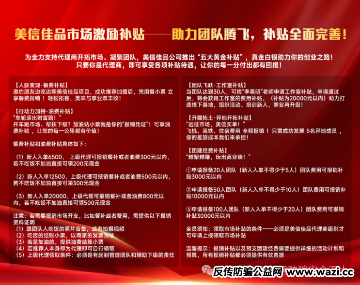 再看美信佳品的模式,懂的人都懂。美信佳品要求参与者缴纳 6500 元起的 “加盟金”,并通过推荐新人获取奖励,具有“缴纳入门费”、“拉人头”、“团队计酬” 的特征。