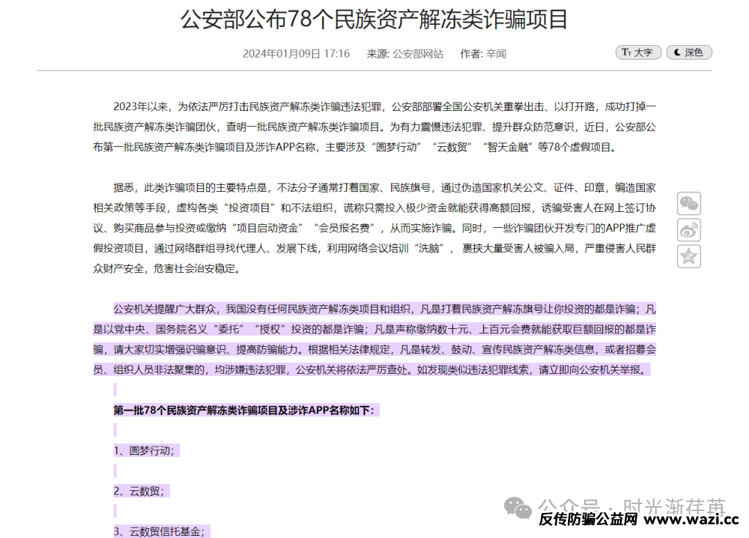 2024年1月:公安部首批公布78个民族资产解冻类诈骗项目,“云数贸”位列第2;