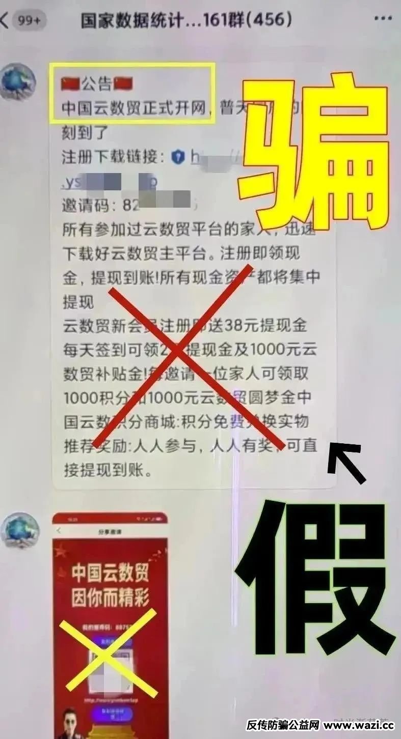 官方明确定性:“中国云数贸”本质是“民族资产解冻”类诈骗的变种,所谓“国家发钱”“数字贸易试点”均为伪造,收款账户为个人卡或境外USDT地址(无对公账户),APP无法在正规应用商店下载,只能通过二维码传播。