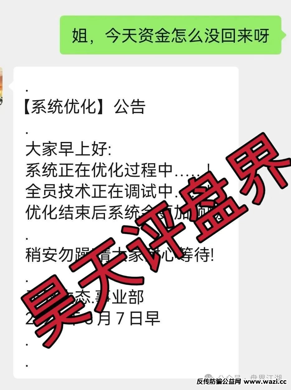 昊天评盘界:这个资金盘昊天之前也爆料过,“易无界”的模式其实就是抢单互助盘资金盘骗局,有受害者爆料已经开始不能提现,公告说是系统升级要到18号才行,老韭菜都懂基本是凶多吉少了,...