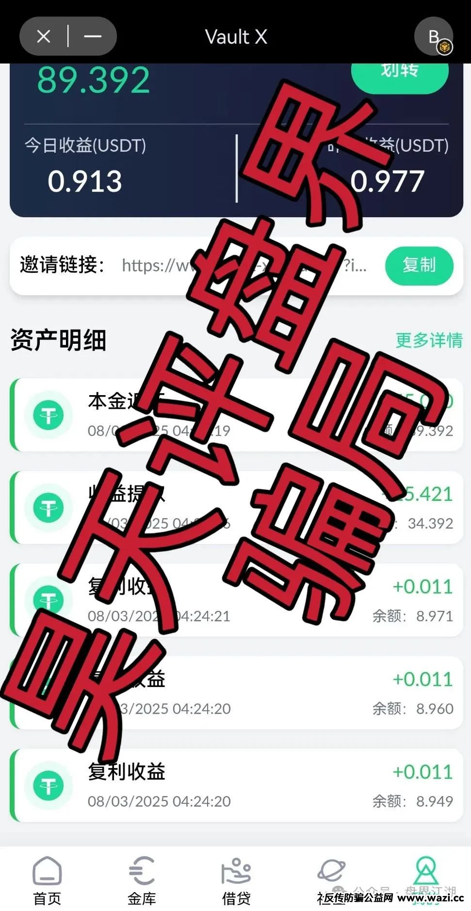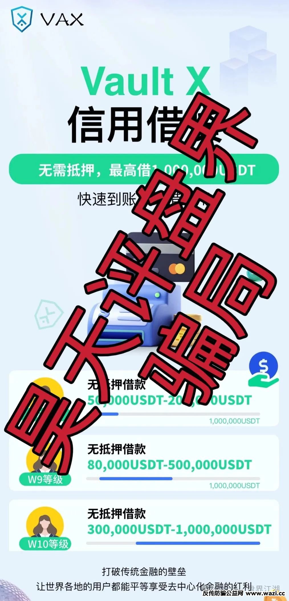 昊天评盘界:近期不少粉丝让昊天爆料一个叫VAX(VaultX)的质押分红类资金盘骗局,目前2万会员,操盘手圈钱过千万,高度预警,即将崩盘跑路!根据爆料人提供的资料显示VAX分为借贷板块、流动...