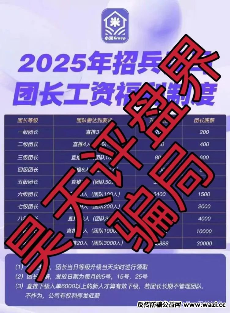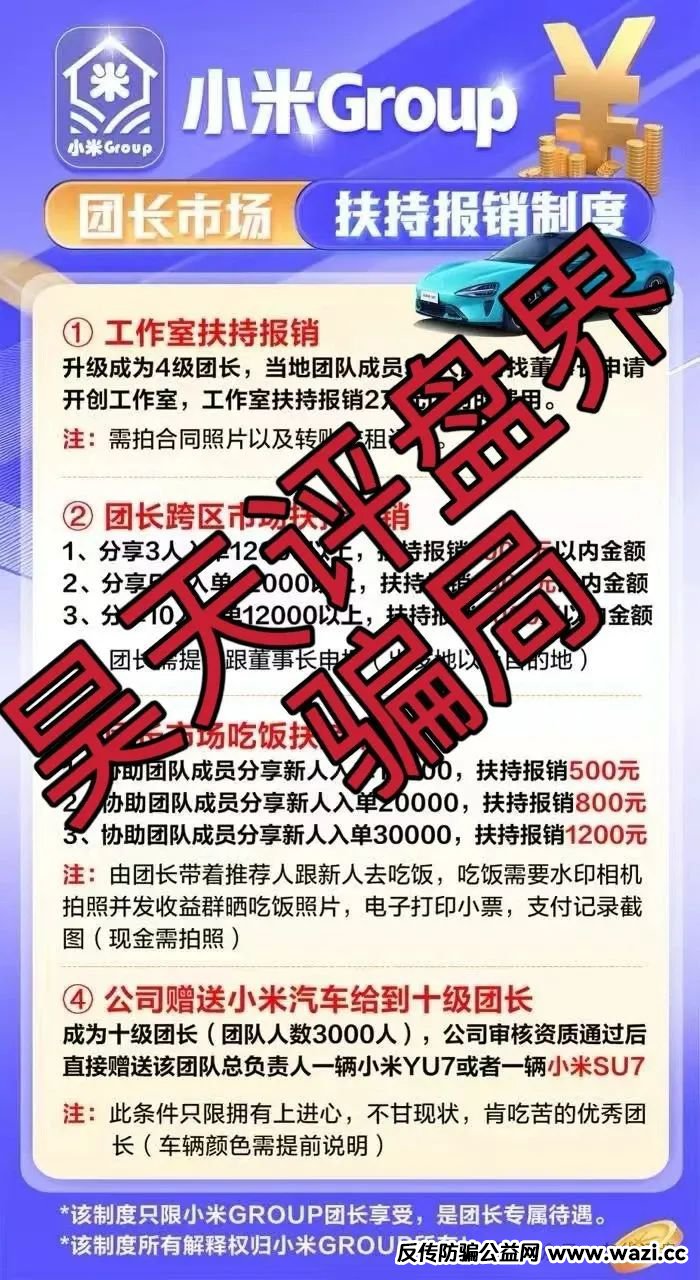 诈骗团伙平移的这个小米Group和之前的资金盘模式还是一样的,一天跟单2场,一场收益1.25%,一天2场的收益2.5%,月收益75%,提款手续费20%,充值需要U,大家也不想想哪个正规公司用u?新人入6000,12000跟单,下午14:30,20:30提前半个小时上线到群里学习洗脑等套路,平移盘就没有时间长的,高度预警,即将崩盘跑路!