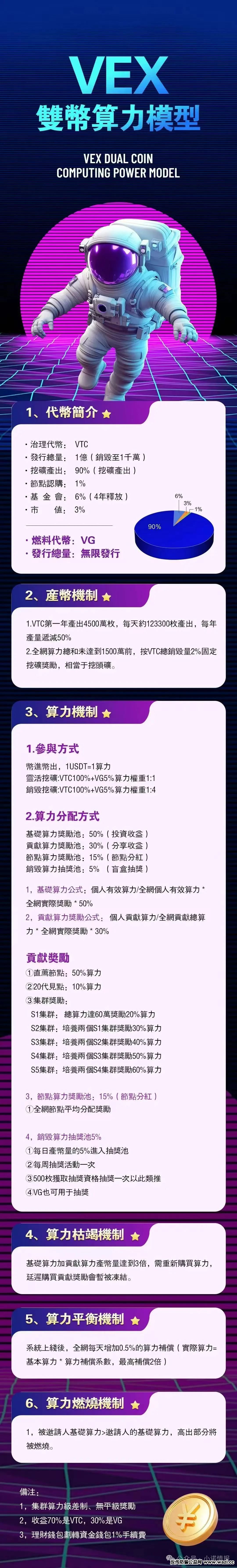 但是有一说一啊,当小诺仔细了解VEX这套挖矿模式之后,觉得还是有一点点新意的,很多东西换个叫法,那就会让人有耳目一新的感觉。下面我就说一下VEX的挖矿模式。网友们应该都比较熟悉,这类项目无非就是弄个虚拟网络矿机产币,想产币就要先质押,或者买虚拟矿机。那么VEX的玩法有两种,第一种是买代币VTC和5%的VG燃料币质押挖矿,产出比是1比1。第二种是买代币VTC和5%的VG燃料币直接销毁式的挖矿,产出比是1比4。质押挖矿我就不说了,这个销毁挖矿就等于是你花钱买了矿机是一个道理,直接消费掉了。能得到的好处是比同等投资额的质押挖矿多4倍的算力。实际就是购买矿机一样的。另外还要再说一下这个VG燃料币,它是在挖VTC的同时按算力比例产出的另一种代币,用处就是在投资人购买算力的时候作为一种手续费代币来使用。想参与VTC挖矿的投资人要向自己的推荐人或者团队其他成员购买VG币,价格是固定的1VG=1USDT。VG币只能在自己本团队内互转使用,不能转到其他团队。如果提现的话要花费5%的手续费。
