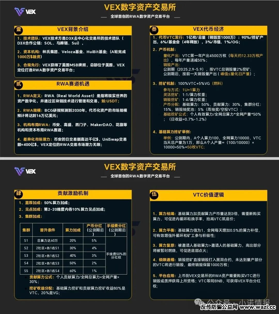 总结一下,VEX数字交易所以及其推出的代币VTC,就是一个普通的以挖矿和RWA最掩盖包装的币圈资金盘项目!操盘手程天对外宣传说VTC是对标币安的代币BNB,简直就是可笑,你跟币安怎么比?一个为了收割创立的野鸡交易所和币安去比吗?忽悠中年妇女还是可以的。动态6个层级已经涉嫌传销了,现在敢这么干的也就是国外这些币圈盘了!