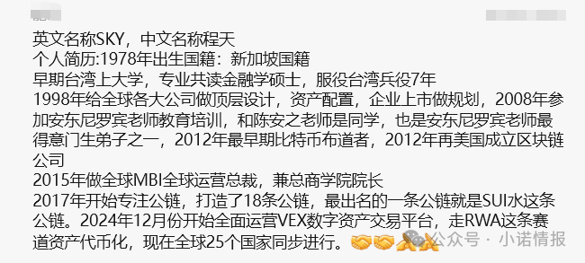 首先咱们先说说这个项目的操盘手“程天”,这都不一定是真名,大家当个代号看看算了!下面是他的简介,其他的都不说,唯独一条提到他跟陈安之是同学,小诺就想笑了。陈安之的名声已经多臭了,还有拿他出来宣传当背书的,不提这人还好一些,提了反而是一种讽刺!据该项目的推广者跟小诺讲述,VTC于今年2月份正式开始推广到现在有半年的时间,项目方老大程天一直在市场第一线站台,很多人在币圈玩盘这么多年没看到哪个老板这么抛头露面的。诺局长听到这样的感慨真是哭笑不得,现在币圈盘子操盘手哪个是中国籍?都跑东南亚小国入籍去啦,这个资料里写程天是新加坡籍,估计这一条100%是真的,不然他敢跑国内站台吗?项目初期跟着跑跑市场,中后期估计早就不见人影了!小诺劝大家一句话,资金盘玩归玩,但别上头!