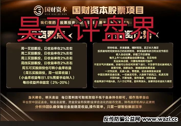 昊天评盘界:今天要给大家爆料的是一个叫“国财资本”的股票跟单类资金盘骗局,app页面和模式跟昊天一直曝光的股票跟单类资金盘一样,也是群里跟着所谓的“导师”群里买股票跟单,这个资...