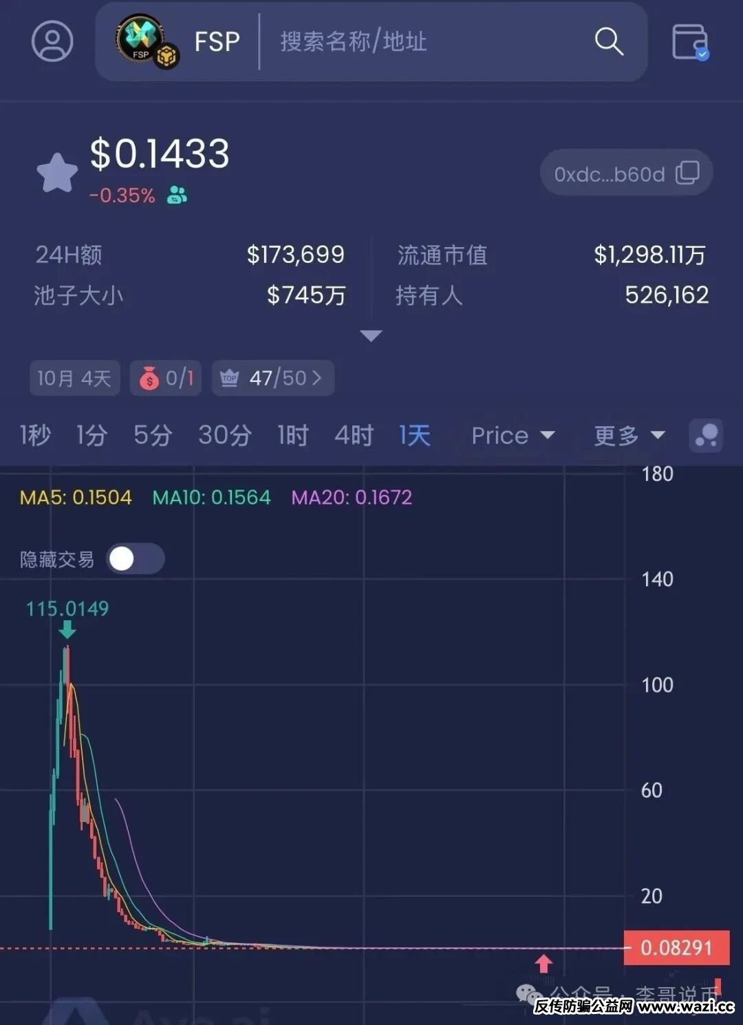Aifeex发行的AFX,也会像当年风投趣发行的FSP一样,拉高币价质押卖矿机一样的玩法和套路,然后一路出货下跌,完美收割韭菜,毕竟1.0韭菜身上的油水还没榨干,2.0在榨干一次,下面是当年分投趣转型发币质押的,币价拉高115U,一路下跌出货。