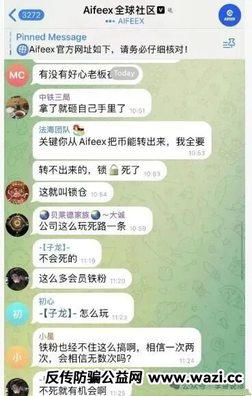 社群里面呢,管理员早就不上线了,但还是有一些人在那里鼓吹Aifeex有多好,让大家继续投钱。2025年5月的时候,就已经有提现通道堵塞的情况了,资金延迟超过30天还到不了账。客服就只会说老板出国了、系统升级中,这些都是资金盘跑路的老套路了。