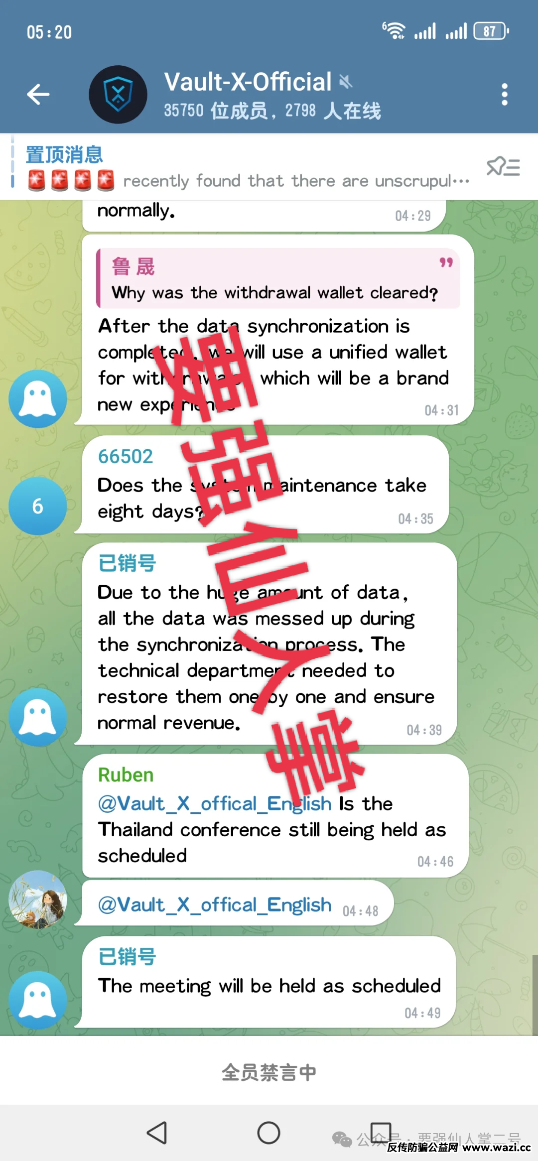 在来看看群里的托,账号全部注销,全员禁言,前面文章我就说过VAX前期利润设置过高,还存在复利增长模式,除非它从一开始就没打算长期运营,只想捞一笔就走,否则按照这种利润模式,根本维持不了多久,很快就会进行收割。