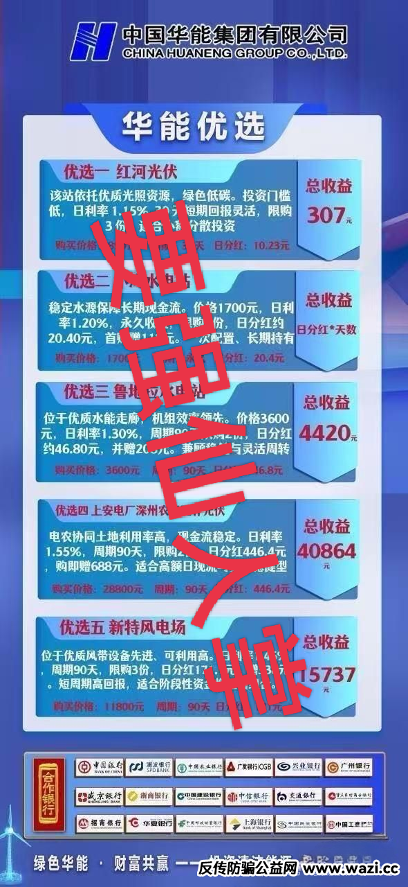 经查询“华能优选”资金盘盗用“中国华能集团有限公司”的旗号进行招摇撞骗,其运作模式更是充满了欺骗性,以投资“水电、光伏、电厂、煤矿等为虚头,以超高收益吸引众人参与,”高利日化率在1.25%-1.62%,折算成年化率高达456%-591%,如此之高的回报率,巴菲特知道了都得亲自上门拜访,根本无法通过正常的商业运作来实现,这就是典型的以高额回报为诱饵的资金盘骗局,其参与的风险极高。