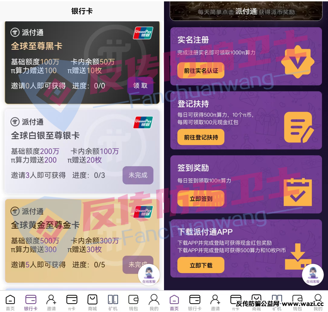 7、派付通 APP:假冒派币,称实名注册可得 20 万元数字人民币和 1000π 算力,还有 “矿机” 出 π 、多种高端银行卡。实际是病毒软件,通过虚假奖励套取用户信息,后续以激活卡、交管理费和税等为由诈骗。