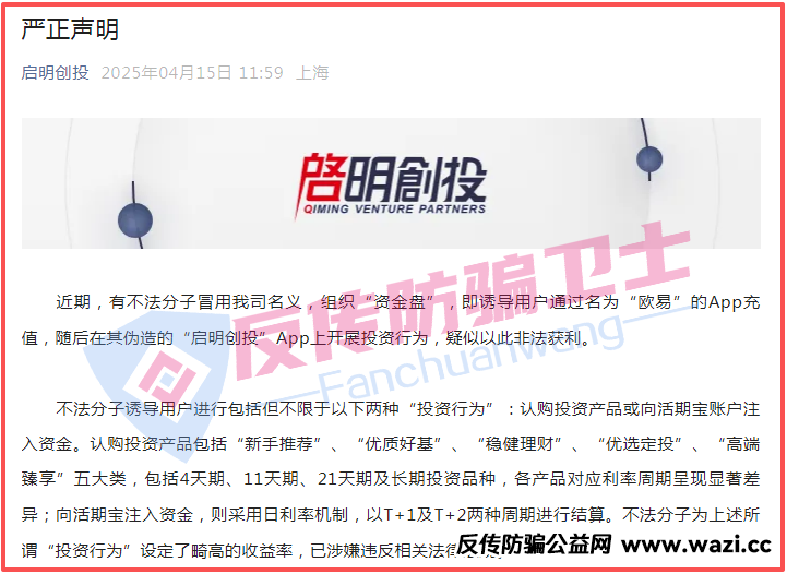 正规启明创投无官方 APP,已发声明辟谣,提醒投资者勿信网络高回报理财。
