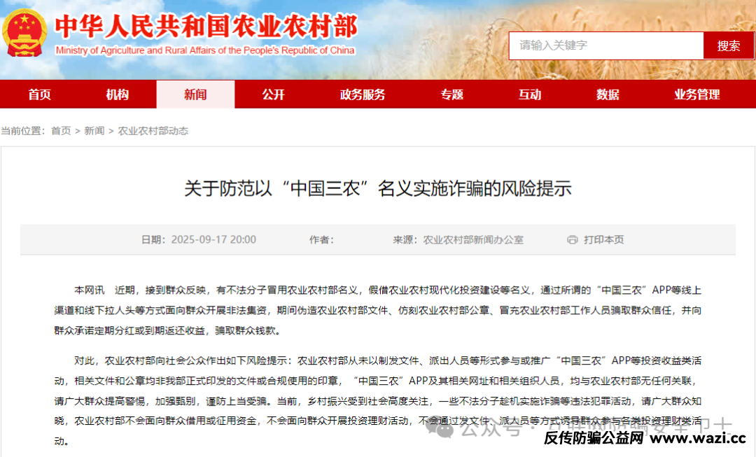 9 月 17 日,农业农村部深夜发布紧急风险提示,直指近期出现的冒用 “中国三农” 名义实施诈骗的违法犯罪行为。这份加急发布的警示背后,是不法分子伪造部委文件、仿刻公章,通过虚假 APP 骗...