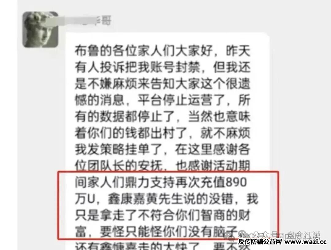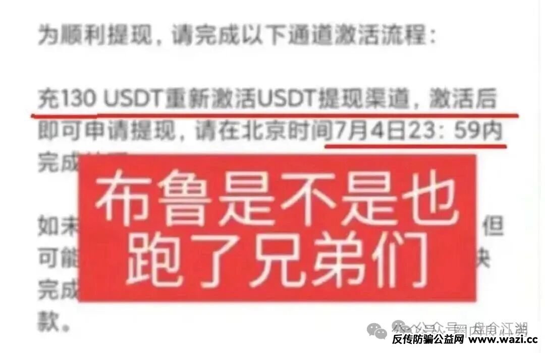 玩项目这么多年,也看过很多跑路盘,最怕的不是看到直接崩盘,而是数据平移、重启、激活、认证费等等这些,行业新生二次收割的代名词,因为一旦出现这些关键词语,那就是表示割玩家的噩梦开始,在这立举个列子来讲解,上个月跑路爆雷鑫慷嘉dgcx交易所之后又有一个布鲁交易所的操盘手,他在关网后,利用大家沉没成本心里,再次收割激活费用,总共加起来有890w美金,真实应了行业那句话,我是秦始皇,不要问直接打钱。