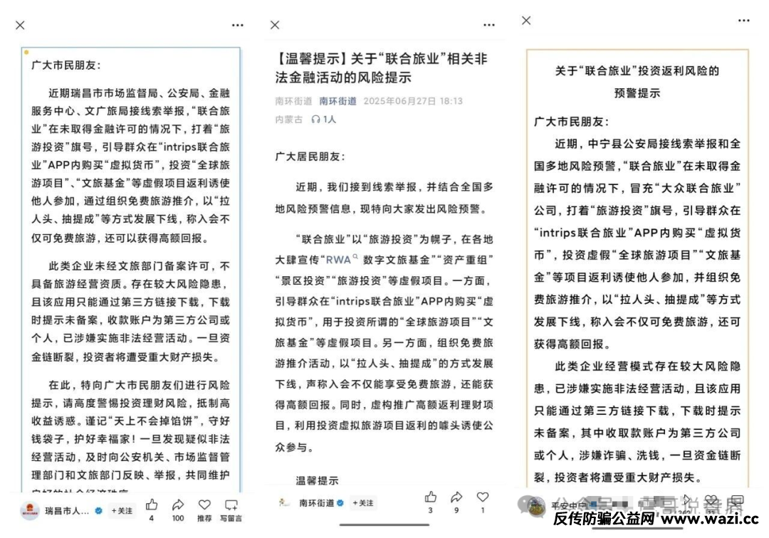 朋友们,我是震哥。后台最近被这个“联合旅业intrips”刷屏了,好多朋友来问,甚至还有已经投了钱在纠结要不要追加的。今儿震哥必须给大家把这层画皮彻底撕开,这根本就是个打着“旅游投资”旗号的典型资金盘骗局,多地警方早就发出预警了!