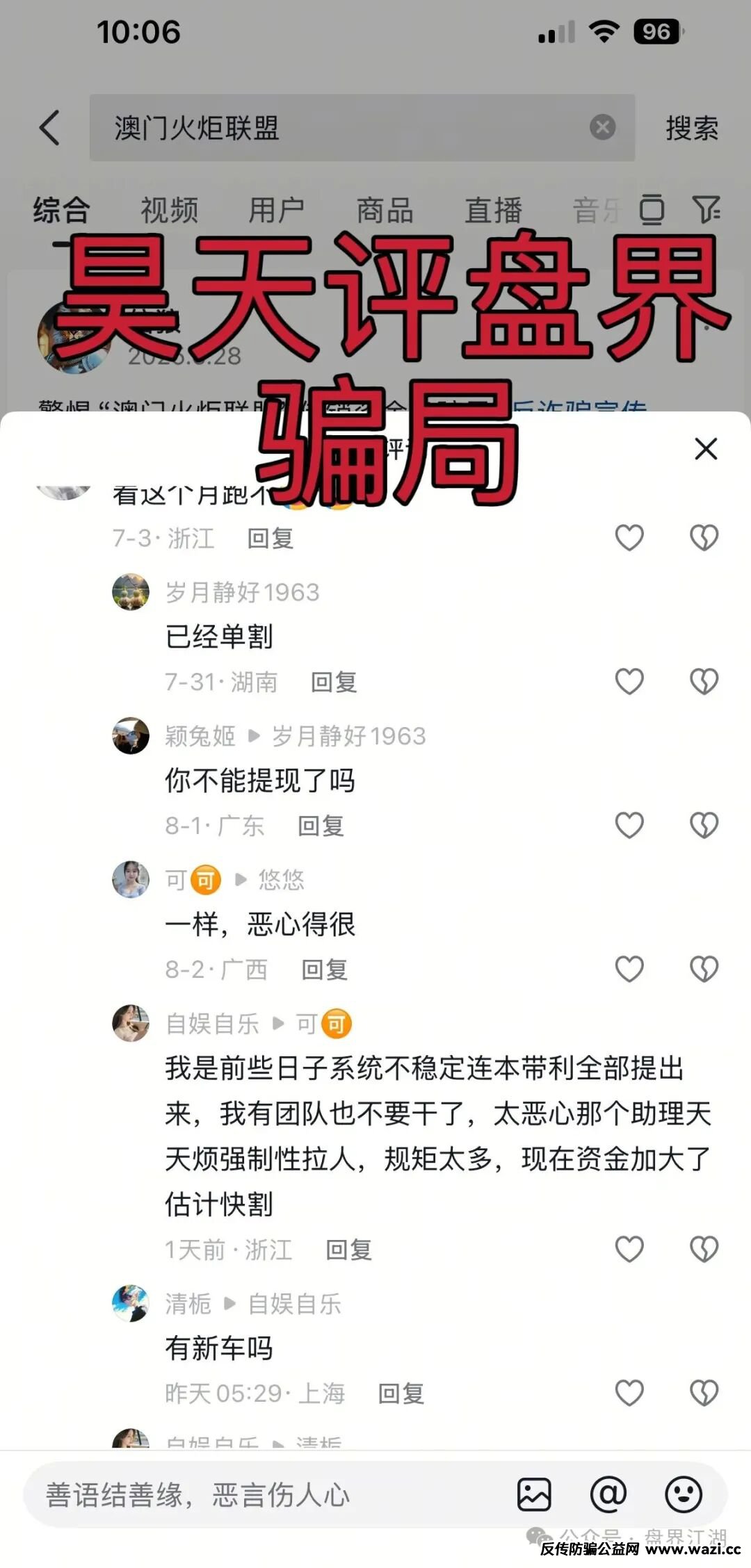 昊天评盘界:澳门辉煌火炬联盟合约跟单类资金盘骗局,之前昊天预警过2次,相信看过昊天文章的粉丝都已经安全撤离了,据受害者爆料目前11万会员,操盘手李逸川圈钱过亿,大量单割会员,高...