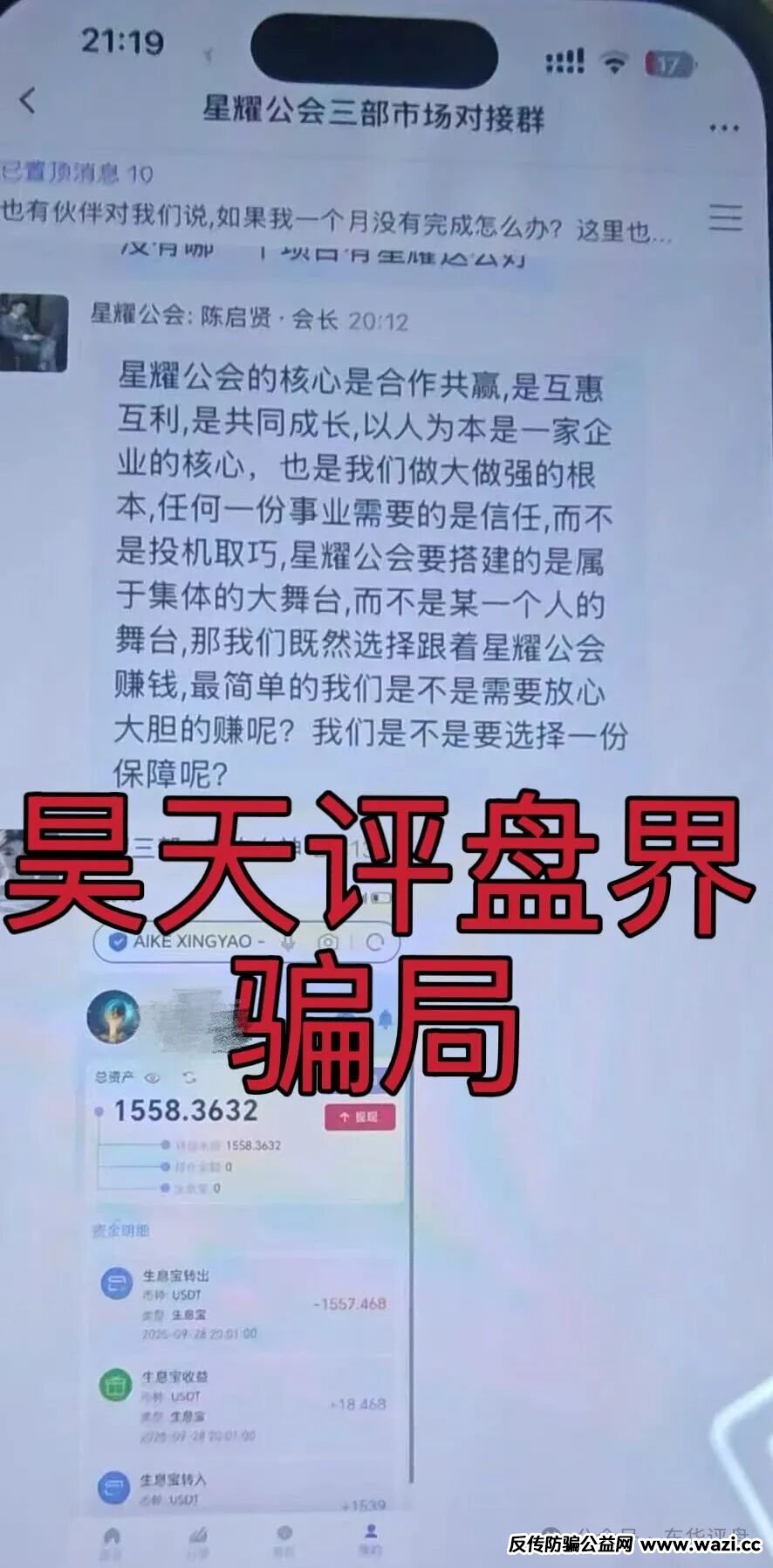 昊天评盘界:近期不少粉丝爆料了一个叫“艾克星耀”的资金盘,昊天看了一下就是之前的“博股会”改名的平移重启盘,当时昊天预警过,后来开盘一个多月就崩盘跑路了,昊天看了一下这次连...