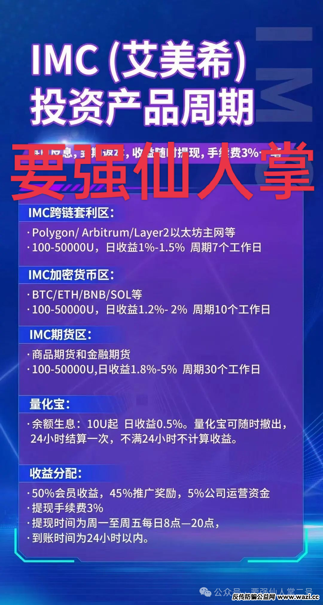 每天都有各式各样的盘子上线,同样也会有各式各样的盘子崩盘跑路,今日必须重点曝光一个短命盘资金盘——“IMC(艾美希)”,话不多说先上图: “IMC(艾美希)”是今天上线盘子,我大致的看了下...