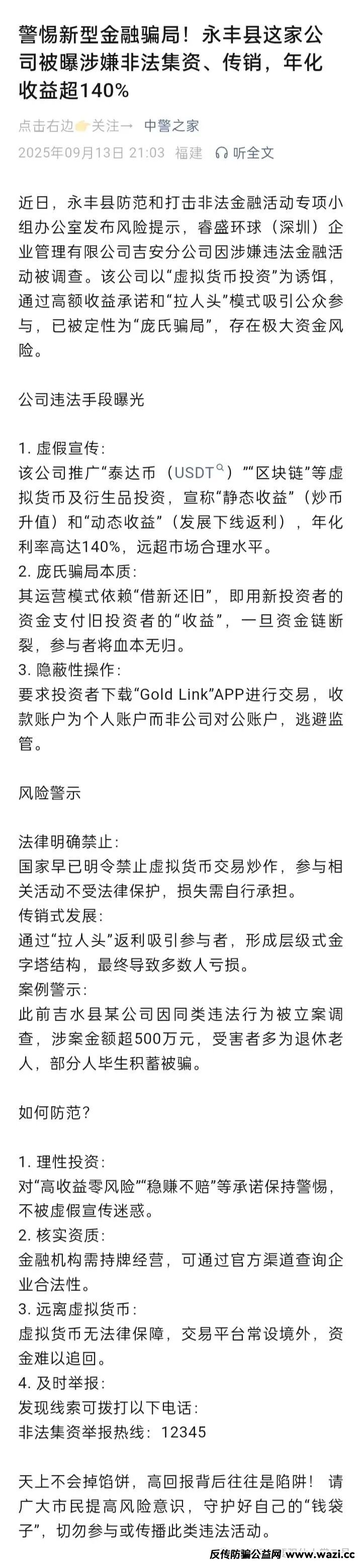 并且各种防止“睿盛环球Golden Link”资金盘诈骗的预警不断,先是“永丰县经侦大队发布风险预警”,然后是“国家级井冈山开发区发布的非法金融预警”,到现在“中警之家发布集资、传销预警”,这不是偶然,也不是巧合,已经是实实在在提防大家预防上当受骗!