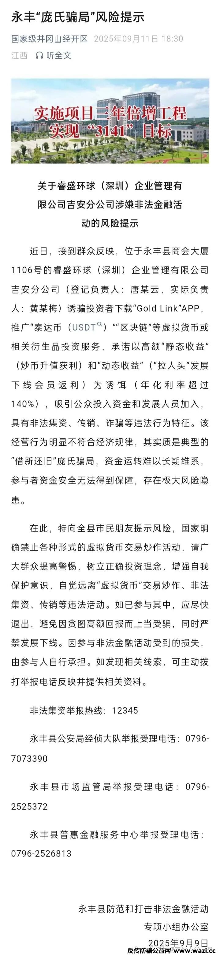 〖国家级井冈山经开区9月9日,发布“睿盛环球Golden Link”非法金融违法预警〗