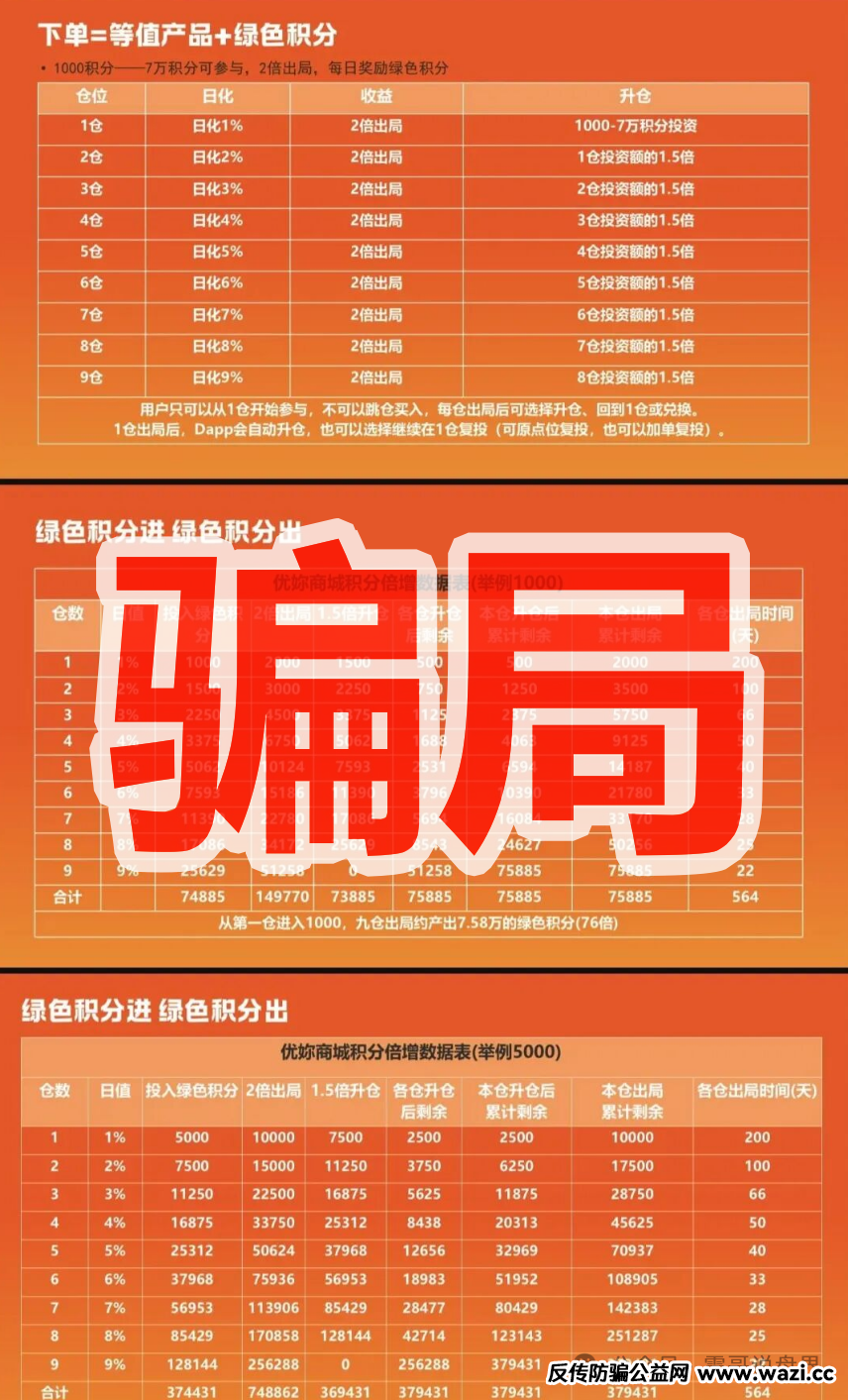 老铁们,又有个叫"优妳商城"的消费盘在疯狂割韭菜!打着"消费返利"的幌子,实则是年化365%的庞氏骗局,震哥今天必须给它扒个底朝天! 一、静态收益:消费返利藏陷阱 吹什么"1倍积分变2倍",仓...