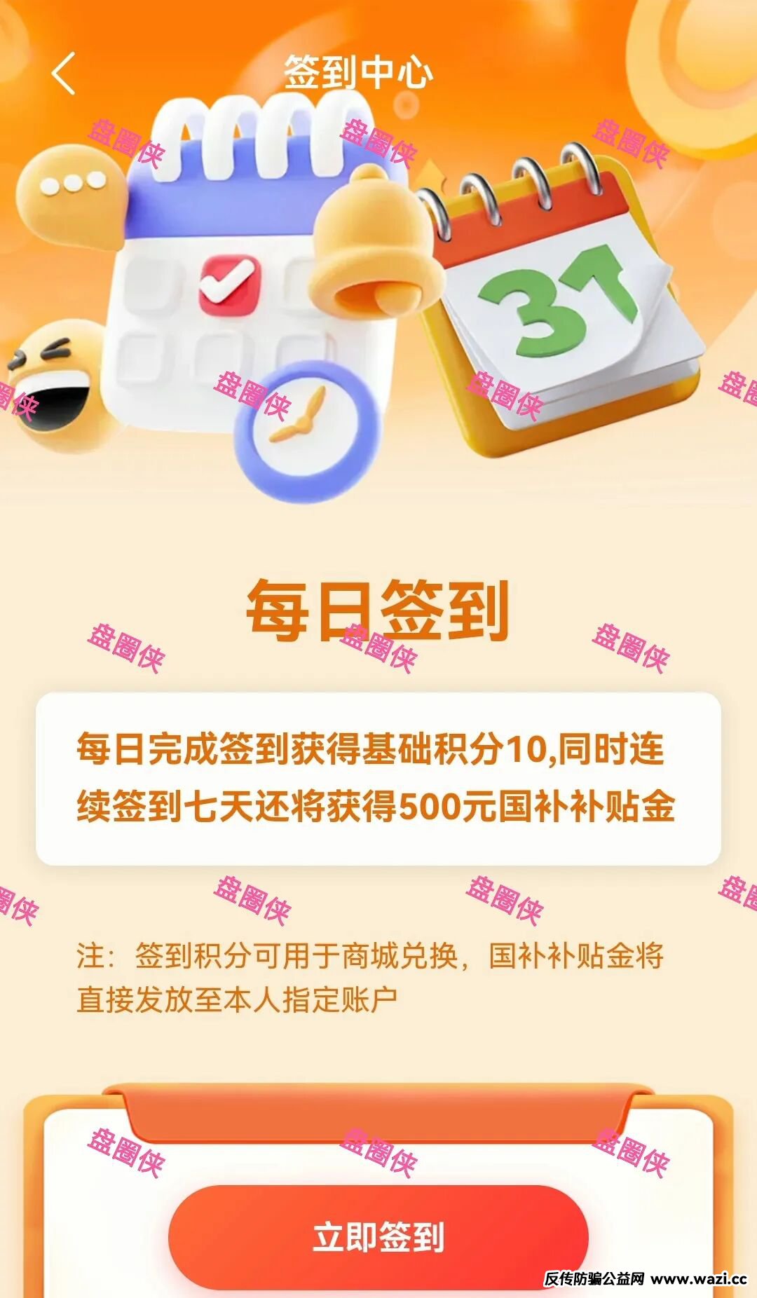 注册需简单实名认证,每日签到获得基础积分10,同时连续签到7天获得500元国补补贴金,签到积分可用于商城兑换物品,积分商城暂未开放。