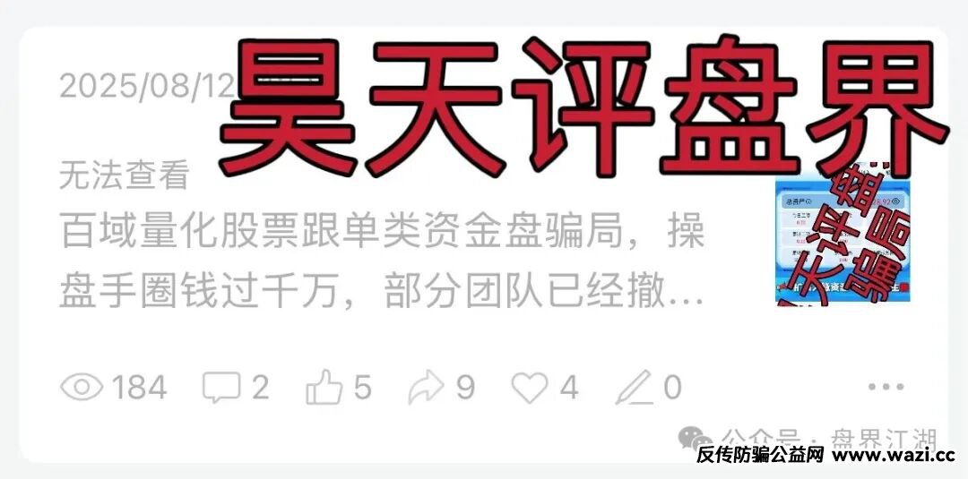 昊天评盘界:近期不少粉丝给昊天爆料了一个叫百域量化的股票跟单类资金盘骗局,用的诈骗app叫“百域量化”,昊天看了一下月收益高达92%,年化1100%以上,典型的资金盘骗局!据知情人爆料目前...