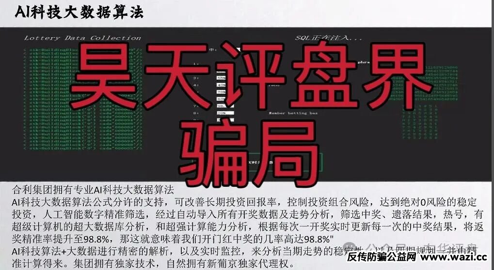 这种彩票骗局包装都差不多,这个合利集团骗局自称专业AI科技大数据算法,改善长期投资回报率,控制投资组合风险,达到绝对0风险的稳定投资,人工智能数字精准筛选,经过自动导入所有开奖数据及走势分析,筛选中奖、遗落结果,热号,有超级计算机的超大数据库分析,和超强计算能力分析,根据每次一开奖实时更新每一次的中奖结果,将返奖精准率提升至98.8%,那这就意味着我们开门红中奖的几率高达98.8%",集团核心“市场分享为主,计划打彩为辅”“市场决定收入,团队成就你”良性发展五五传递管理。目前,我国并未批准任何彩票机构开通利用互联网销售彩票的业务,也就是说,所有网上售彩都属于非法行为。这些诈骗团伙他们的目的其实就是变相的让你去拉人头...