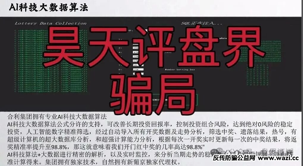 收到粉丝爆料,合利集团搞了个彩票带单资金盘,打着AI大数据、高精准中奖率的幌子,忽悠人投钱。其实套路还是老一套,什么“绝对零风险”“98.8%中奖率”,吹得天花乱坠,结果就是个拉人头、割韭菜的杀猪盘。
