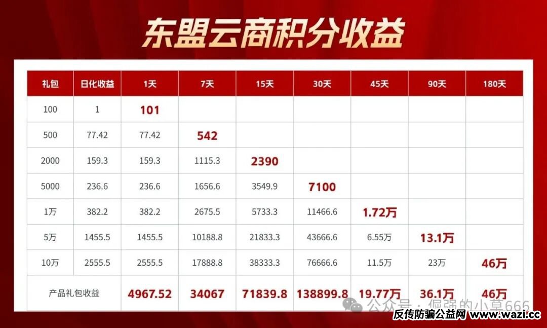 最近一个叫“东盟云商”的项目在微信群、朋友圈、小红书、抖音疯狂冒头。宣传话说得天花乱坠:消费就能拿积分,积分能换礼包,质押还能日日分红,收益日化高达2%!听着是不是像边花钱边赚钱,轻松实现“消费返利自由”?可真相却是——这根本不是什么新模式,而是一个披着“跨境电商”外衣的老式资金盘,专割普通人钱包。