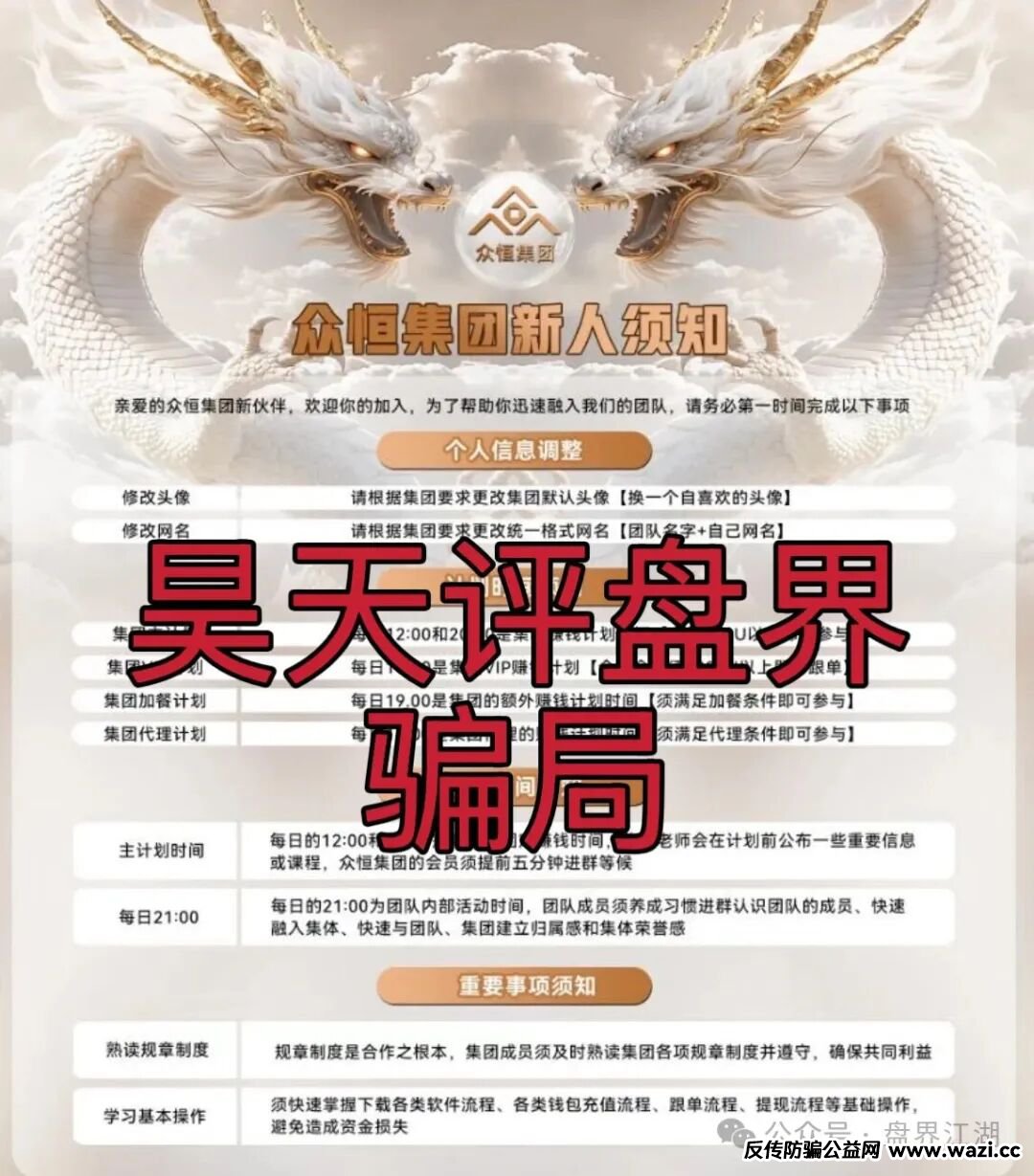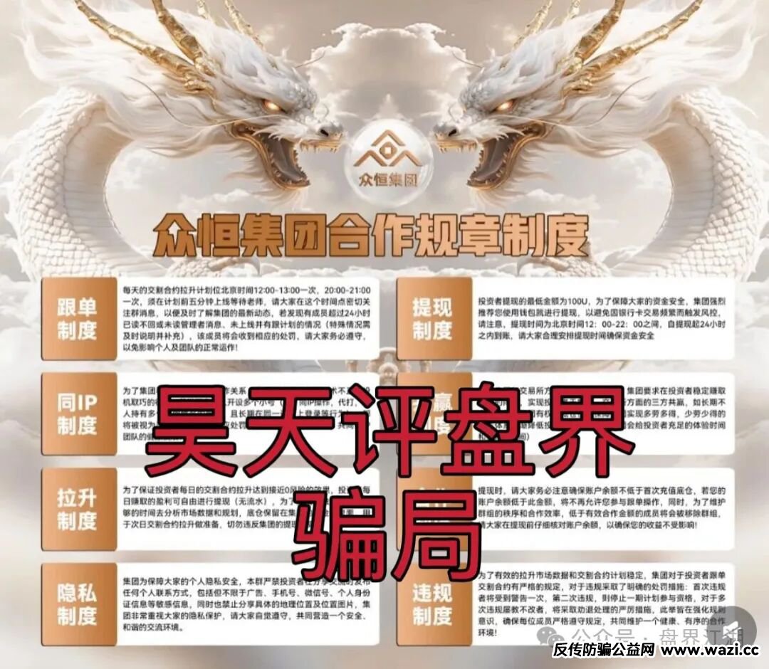 昊天评盘界:近期不少粉丝让昊天再曝光一下这个叫众恒集团的交易所合约跟单类资金盘骗局,打着一键合约跟单的幌子搞的杀猪盘,诈骗平台规定每天的交割合约拉升计划位北京时间12:00-13:00一次,20:00-21:00一次,须在计划前五分钟上线等待老师,若发现有成员超过24小时已读不回或未读管理老消息、未上线并有驭计划的情况,该成员将会收到相应的处罚,为了保证投资者每日的交割合约拉升达到接近0风险的效果,投资者每日赚取的盈利可自由进行提现(无流水),为了集团金融分析师有足够的时间去分析市场数据和规划,底仓保留在集团的资金池里面,用于次日交割合约拉升做准备,据知情人爆料此盘刚开盘没几天就开始单割了,高度预警,即将崩盘跑路…