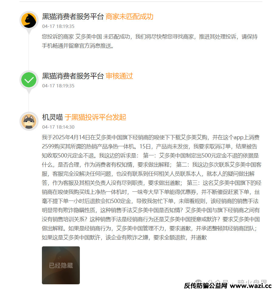 另外还有一点,对于艾多美公司对于品牌信誉维护,以及对销售模式的把控,销售人员的素质,小诺还要多说一点。很多电商公司的销售都存在这各种各样的问题,主要还是公司培训不到位,还有个人素质低下导致的。网络销售中很多代理都想快速成交,所以在与客户沟通过程中或多或少的会把一些关于产品和销售模式的弊端隐藏起来,或者避而不谈。导致消费者在购买产品之后产生一些疑惑时,引发了和销售人员的矛盾和对产品以及公司的更深层次的不满。今天提到的艾多美也存在这种情况,小诺随手在“黑猫投诉”中搜索“艾多美”就看到了下面这样一条投诉。该条投诉发生在今年的4月份,情况和刚才小诺前文写的如出一辙。销售人员素质低下,再好的产品也不会有市场发展的空间。何况在公司未发货的情况下,申请退款还要扣下500元订金。这种霸王条款确实让人无法接受,毕竟你所售的产品不是根据顾客的要求量身定制的,为什么不能退呢?这位顾客不要,可以卖给下一位顾客啊!这种情况是可以投诉到消协,让消协介入的!毕竟艾多美是韩国的品牌,这种做法确实影响品牌形象了!从黑猫投诉处理结果上看,应该是没有达成消费者的意愿,艾多美也没有给予答复。