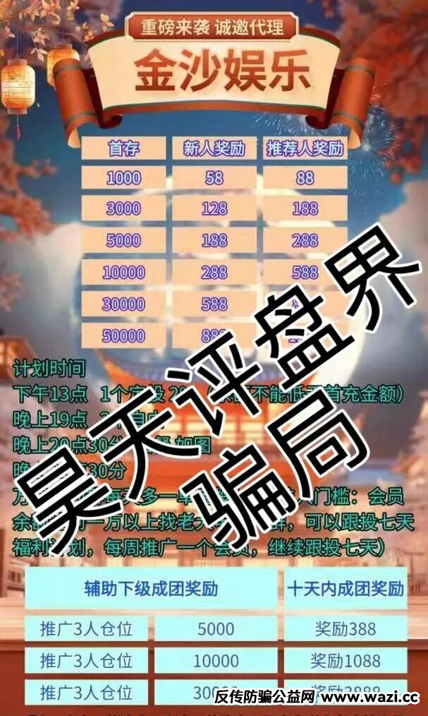 昊天评盘界:近期不少粉丝给昊天爆料了一个叫金沙娱乐的彩票跟单类资金盘骗局,据知情人爆料此盘目前开盘有几个月了又冒充新盘开始各种推广拉人,前天也是单割了一部分会员,加上部分团...