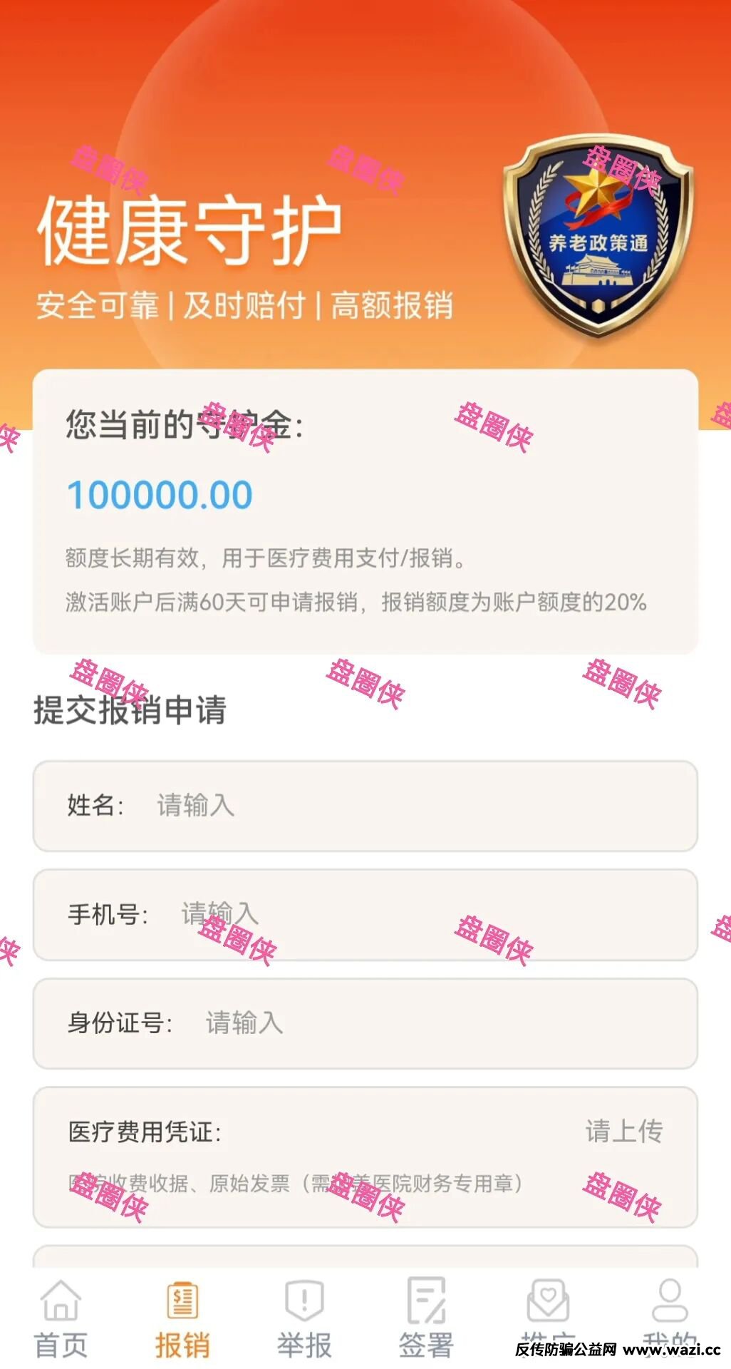 注册登录APP之后就要求实名认证,每日签到获得一次抽奖机会。发放100000守护金,上传病例/发票审核确认之后报销守护金额度的20%,需激活账号满60天才可申请,也就是个骗人的,估计后面产品上线之后,有老年人账户金额比较多的可能有机会申请到账。