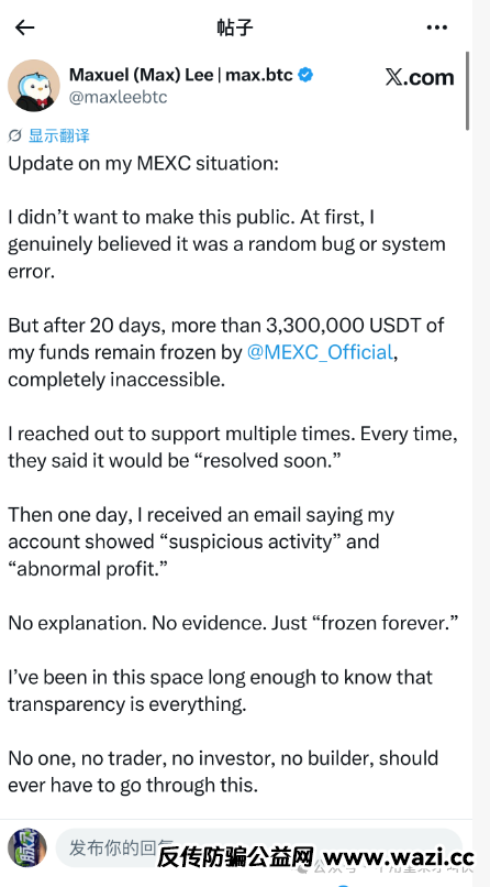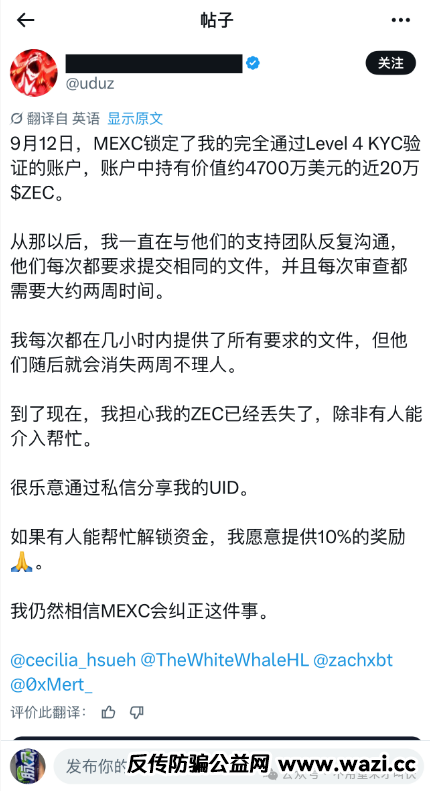 【抹茶MEXC交易所】陷入崩盘危机!爆雷!一用户21.8万枚ZEC被MEXC冻结无法提现,价值超过9000万美金!