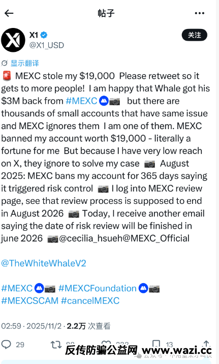 想过抹茶mexc在国际市场玩狠的,但是没想到mexc现在玩的都是不要命的,刀尖儿舔血,专杀大户。 继前天英国用户维权成功之后,大批量的被无故封停提现的用户纷纷开启维权,其中有这么一位:...