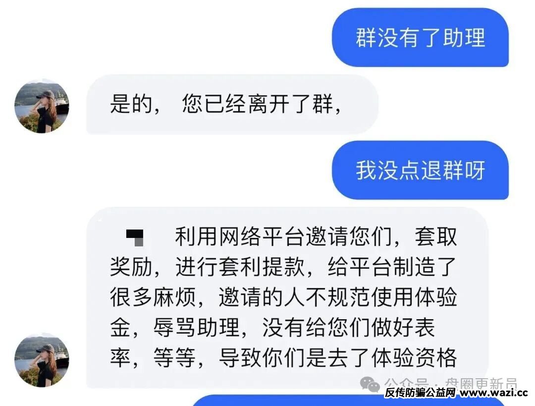 前几天曝光的星运国际cp诈骗盘,最近也是开始套路了,前期通过赠送体验金引流的部分玩家,在疯狂洗脑还是不充值的情况下,已经开始被骗子踢出群,冻结账号。