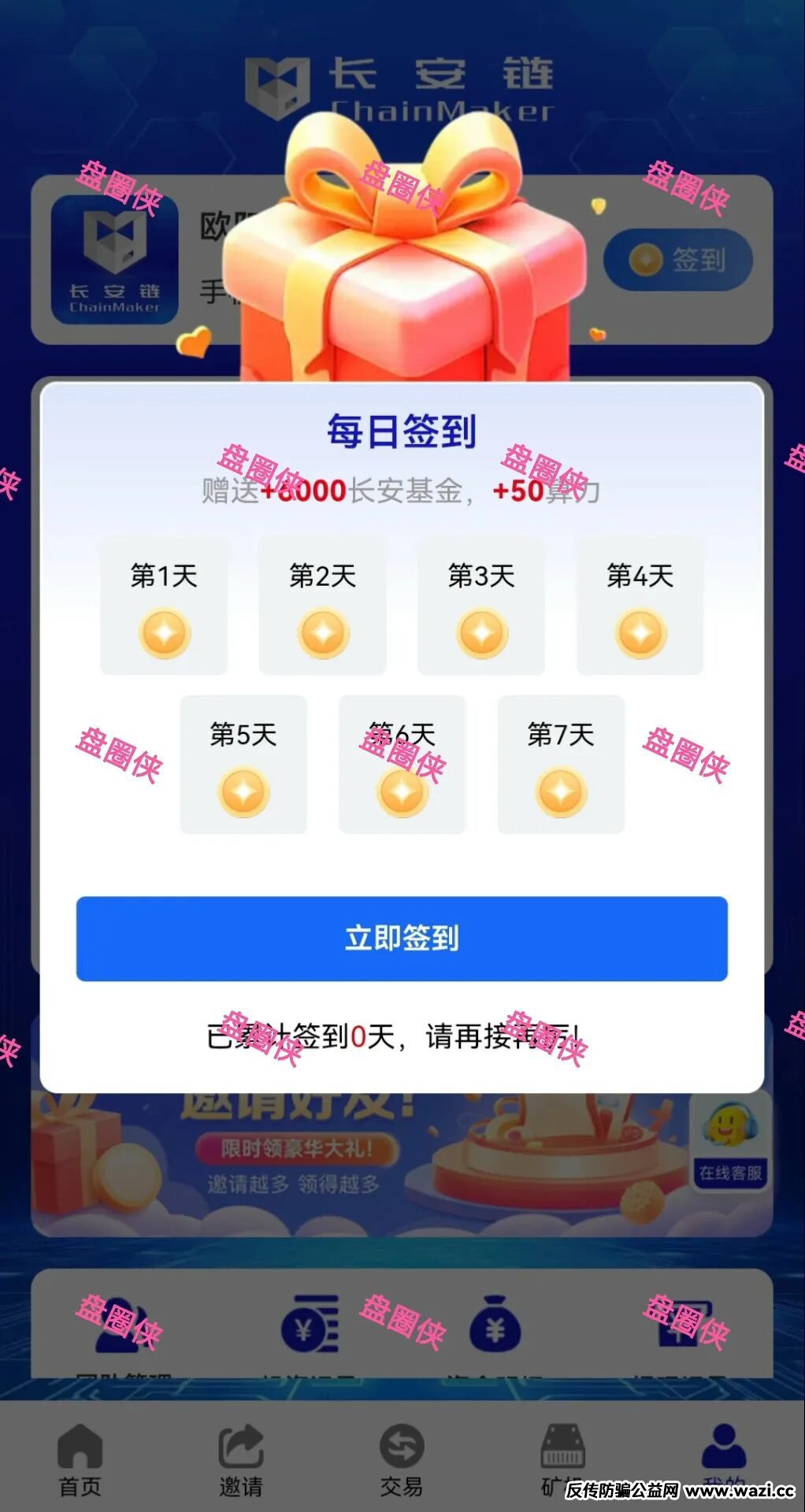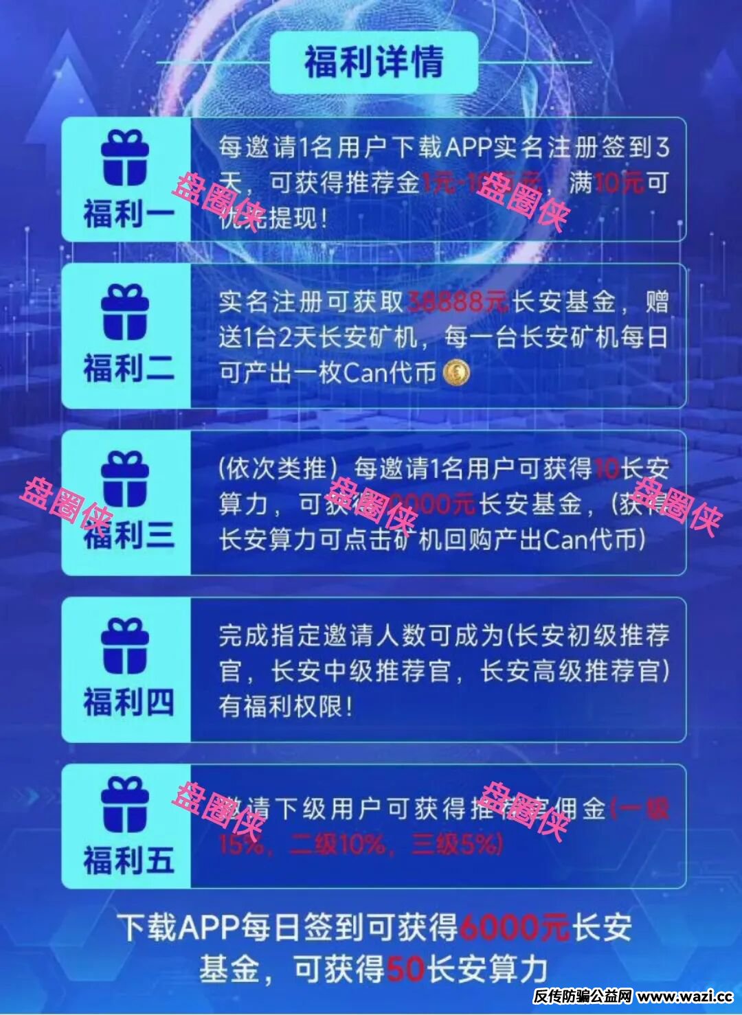 首次实名注册赠送38000元长安基金和一台2天长安矿机,每日产出1枚Can代币,下载APP每日签到获得6000长安基金和50算力,算力可用于购买矿机产出Can代币。
