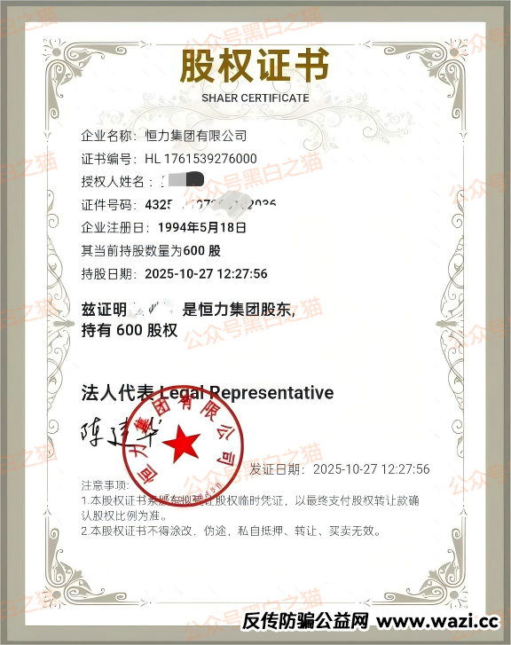 参与过的人记得截图这个股权证书,你会发现很多资金盘搞的股权证书一模一样,无非程序里面设置填写的碰瓷企业不同而已。
