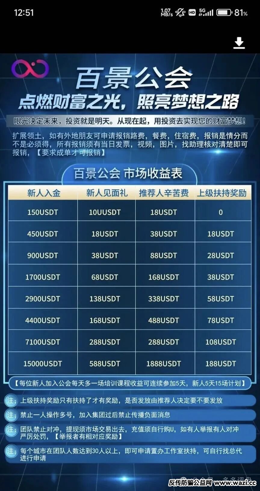 低门槛试水: 150 USDT的入门档位旨在消除戒备,让受害者“小额试水”,体验所谓“快感”。 阶梯式诱惑: 中高额度绑定“丰厚奖励”,利用人性“投入越多,回报越大”的贪婪,诱导持续加码,深陷泥潭。 二、 病毒式扩张:以“合伙人”为名的传销骨架 其生命力完全依赖于“拉人头”的传销本质: 层级奖励: “推荐-上级”体系确保资金由下而上被层层抽成。 黄金枷锁: 以豪车、房产等画饼驱动成员疯狂发展下线,用后来者的资金伪装先驱者的“收益”,维系庞氏泡沫。 三、 场景化洗脑:从线上到线下的全方位操控 骗局不止于线上,更渗透至现实,构建信息茧房: “餐补”公关: “无论成败,皆报销188餐补”是低成本的心理锚定,营造“公会关怀”假象,实则铺垫更大市场投入。 “表演式”聚会: 要求10人以上聚餐提前申请,并拍摄带有“百景公会N-XBit”元素的现场视频,是将线下聚会变为线上宣传的虚假素材工厂,以此伪造繁荣,实施集体催眠。 工作室“背书”: 遍地开花的工作室,为虚拟骗局披上实体外衣,极具欺骗性。