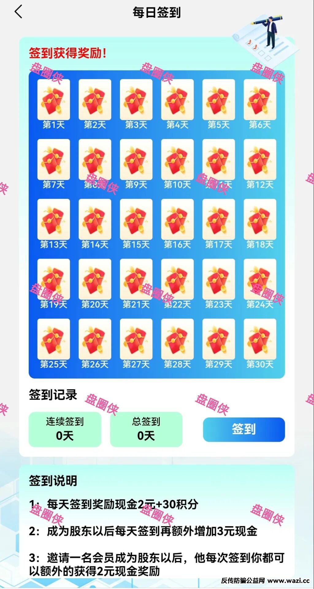 每日签到赠送2元和30积分,积分可用于在商城兑换实物,预售项目产品共6款,最低499元,最高7999元,购买即可获得相应的股权、积分和抽奖次数。