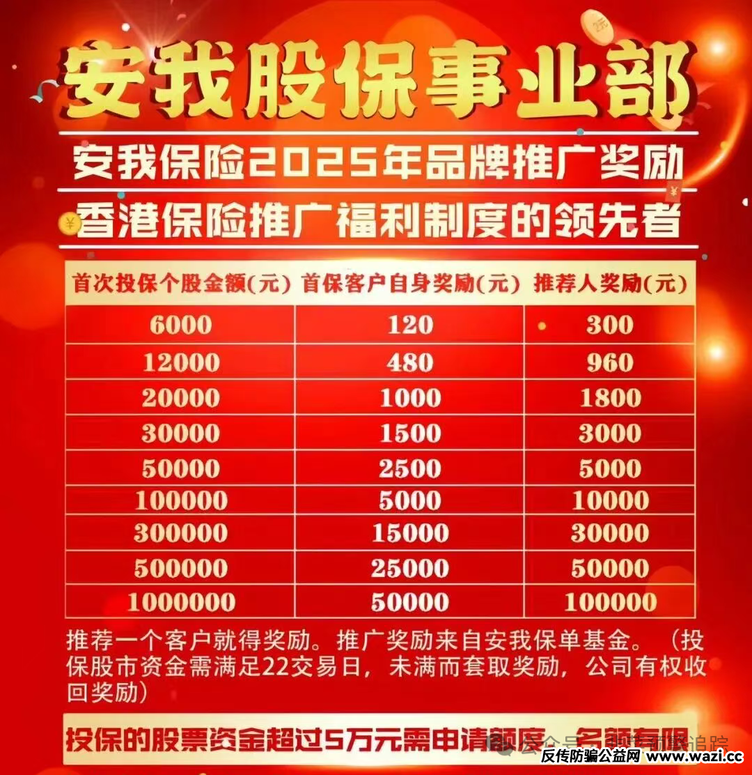 套牌安我股保APP打着炒股亏损全额赔付、月收益60%-100%旗号,诱骗用户跟单投资。中保协已发布风险提示,其并非正规保险机构,所谓“股票投资保险产品”是虚假的,涉嫌非法经营金融业务。现疑似跑路,请大家增强防范意识,远离此类骗局,通过正规渠道买保险。