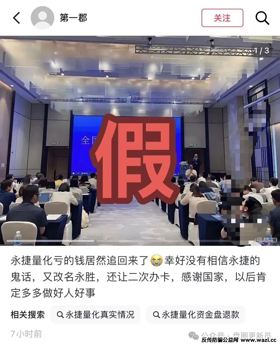 永捷量化,这个诈骗资金盘已经崩盘跑路,虽然诈骗平台跑了,但是骗子依旧存在,今天刷到有视频账户发布关于永捷退钱的视频,一系列操作简直就是影帝,这种套路小编之前也多次曝光,只要有资金盘跑路,你会发现在各种平台都会出现退款的视频,有些是ai合成的假媒体报道视频,还有伪装成受骗人员自导自演退款成功的戏码,无一例外的是,相关视频或者文案里都会有骗子留的诈骗链接,千万不要点击链接,都是骗人的。