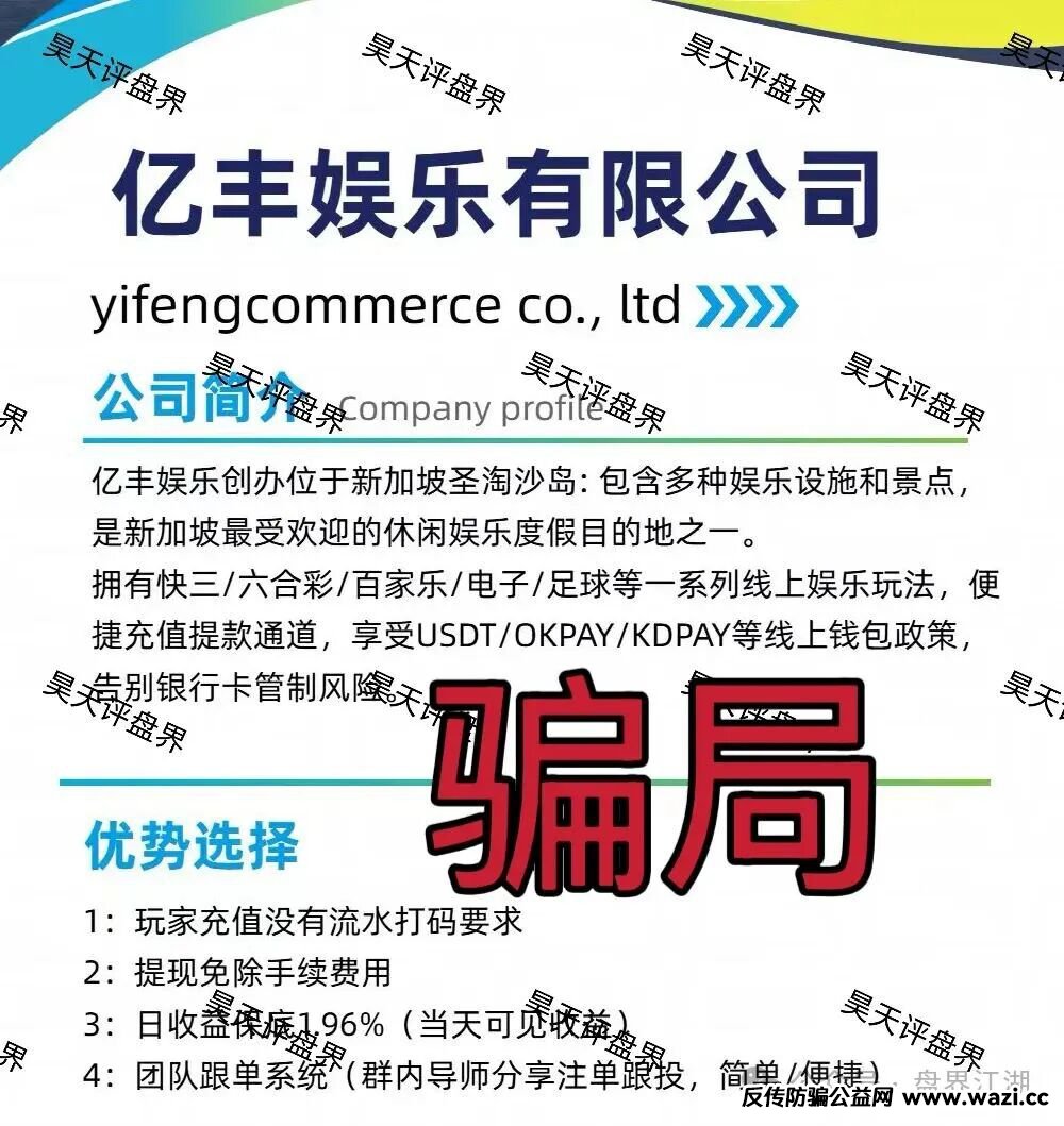 昊天评盘界友情提醒:亿丰娱乐彩票类资金盘骗局,刚开盘1个多月就开始单割了,导师“林皓”柬埔寨的杀猪盘,高度预警,即将崩盘跑路!后面会持续关注!近期知乎,小红书,微博,抖音等app都有冒充昊天的诈骗团伙,记住了我们不做项目,更不会去推广任何项目,除公众号外其他一律不是本人,切勿上当受骗!