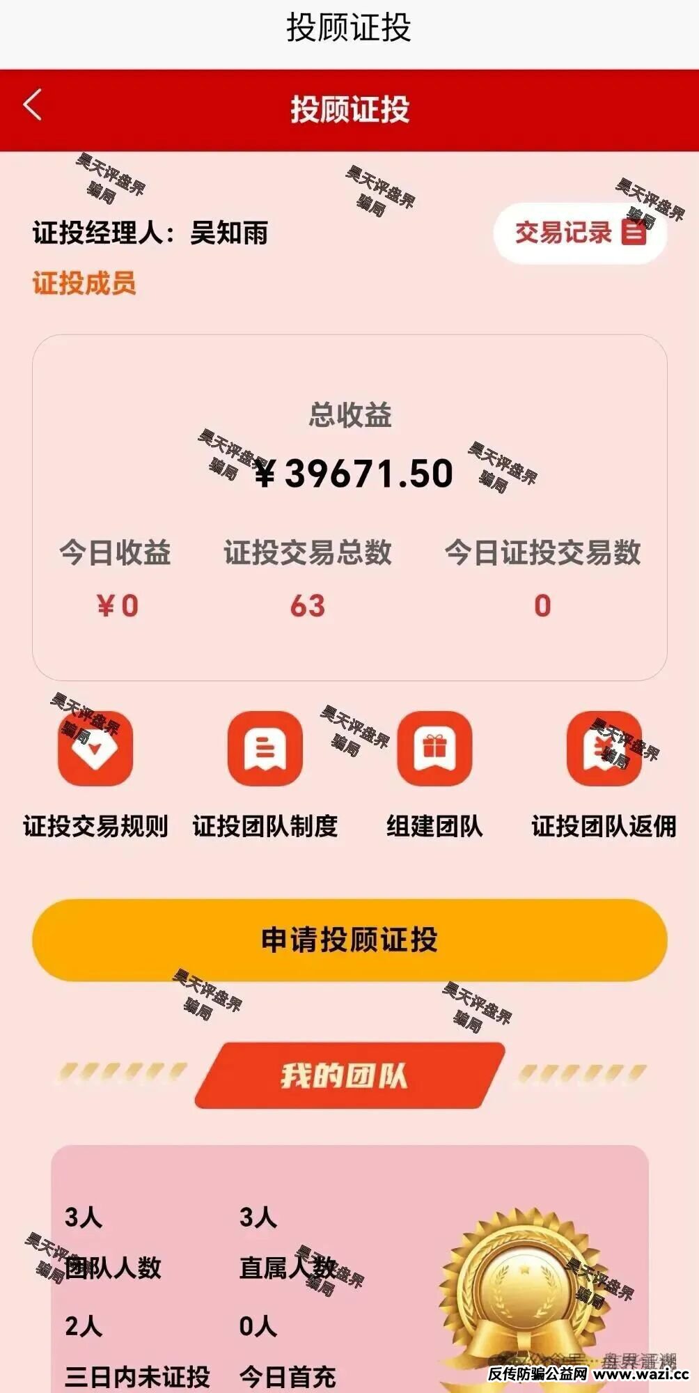 这种模式之前重楼曝光跑路的很多了,套路也都是一样,不法分子冒充某公司的名义,声称跟着“专家”智能炒股,通过各种平台伪装“财经博主”“私募大佬”,晒出虚假盈利截图和股市分析视频吸引关注,再以“免费荐股”为诱饵拉人进群。群内90%以上是托儿,他们轮番晒出“跟单盈利”记录,配合“导师”吴知雨的“专业指导”,营造全员赚钱的假象。随后引导投资者下载未备案的虚假APP,该软件与正规券商界面高度相似,实则是诈骗分子操控的虚拟盘。 骗局核心在于“画饼收割”:平台宣称“AI智能跟单”“月收益保底20%”“亏损包赔”,降低投资者入局门槛。初期小额投资可顺利提现,以此诱使受害者追加资金。而投资者的钱款并未进入股市,而是直接转入第三方个人账号或虚拟货币账户,涉嫌洗钱等违法犯罪。平台还设置“拉人头返利”机制,以8%-20%的推荐奖励鼓励投资者发展下线,形成传销式裂变。