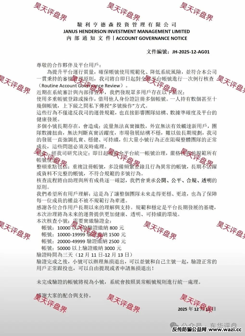 昊天评盘界:名旺集团股票跟单类资金盘骗局,也叫骏利投资,晨星投资,这个盘昊天之前也是预警过2次,据受害者爆料今天彻底崩盘跑路了,诈骗团伙让受害者缴纳8%验证金继续二次收割,已经被调查中,千万别交!老王给出的崩盘理由还是老套路:尊敬的合作伙伴及平台用户:为提升平台运行质量,确保账号使用规范化、降低系统风险,并符合本公司一贯秉持的审慎管理原则,我司将自即日起对全部平台账号进行一次例行核查(Routine AccountGovernance Review)。近期在系统审计与内部排查中,我们发现众多用户存在以下情况:使用多重账号登录或操作,借用他人身份证注册多个账号。一人持有数个甚至十几个账号,上下级之间私下传授“多号操作”方式这些行为不仅违反我司的运营规范,也直接影响团队结构、数据准确度及平台的健康发展。因此,经我司研究决定:即日起启动全平台统一账号治理,严格核查并规范所有账号使用。整顿重点包括:重复注册账号,多设备频繁登录且行为异常的账号,长期不活跃或资料不完整的账号,不符合规范的多号行为,核查流程将由助理与所有成员逐一确认,我们会秉承,公开、公平、合规、透明的原则。这崩盘理由是不是很熟悉?是的,全是一个骗局套路: